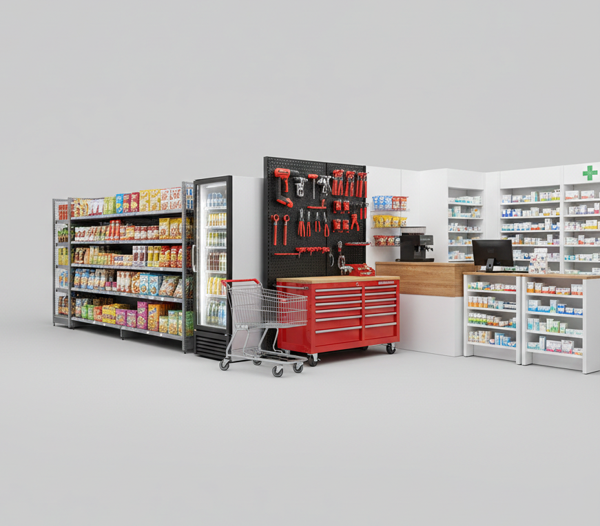 Equipamos desde pequeñas farmacias hasta grandes supermercados con estándares profesionales de exhibición.